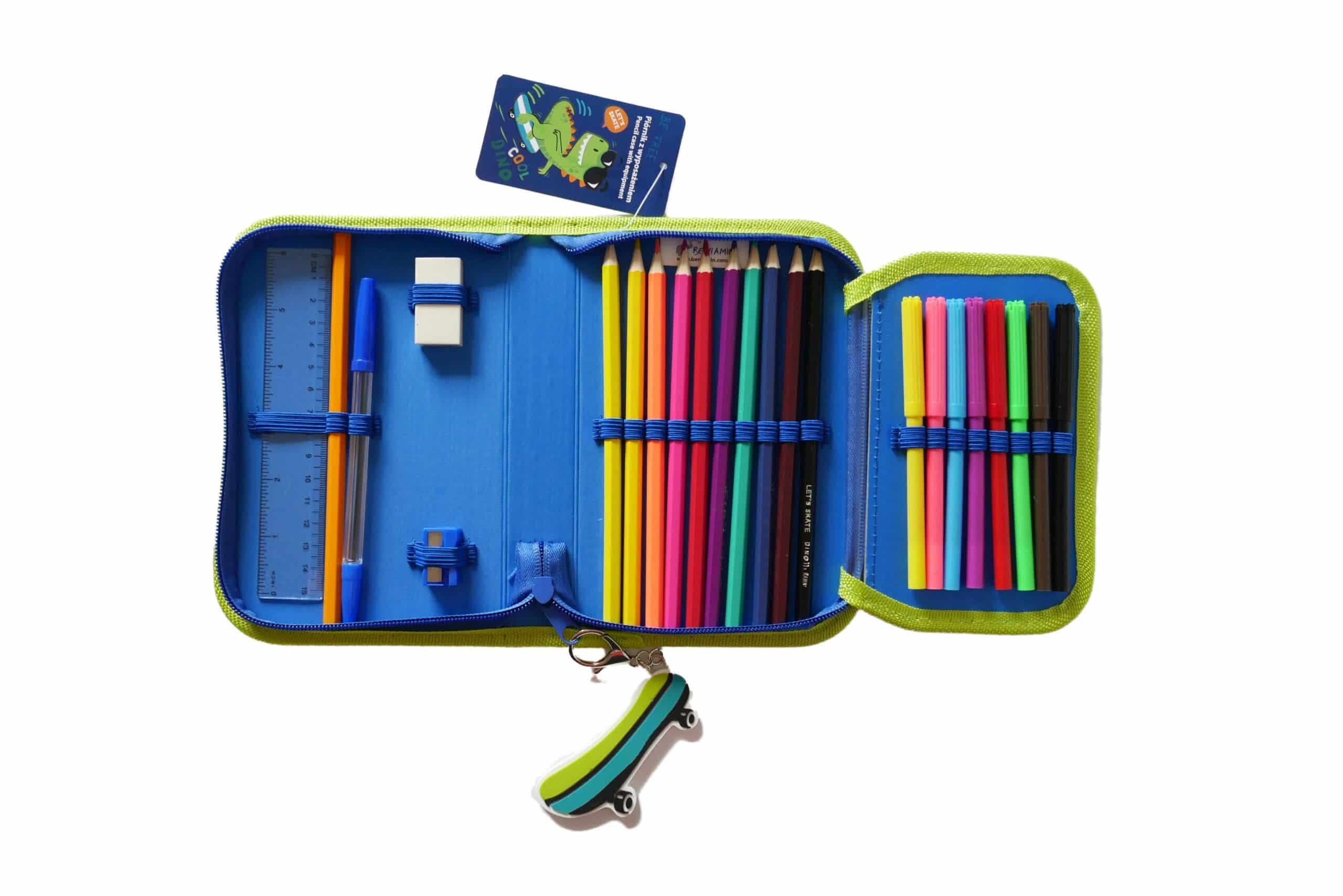 10 kredek, 8 flamastrów, ołówek, długopis, gumka do mazania, temperówka, linijka 15 cm
